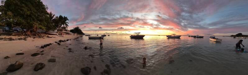 Terminamos viendo dos playas de camino a Tamarin y en el mismo Tamarin vimos el atardecer en el mar. El agua del mar está calentita, más que la de la piscina.