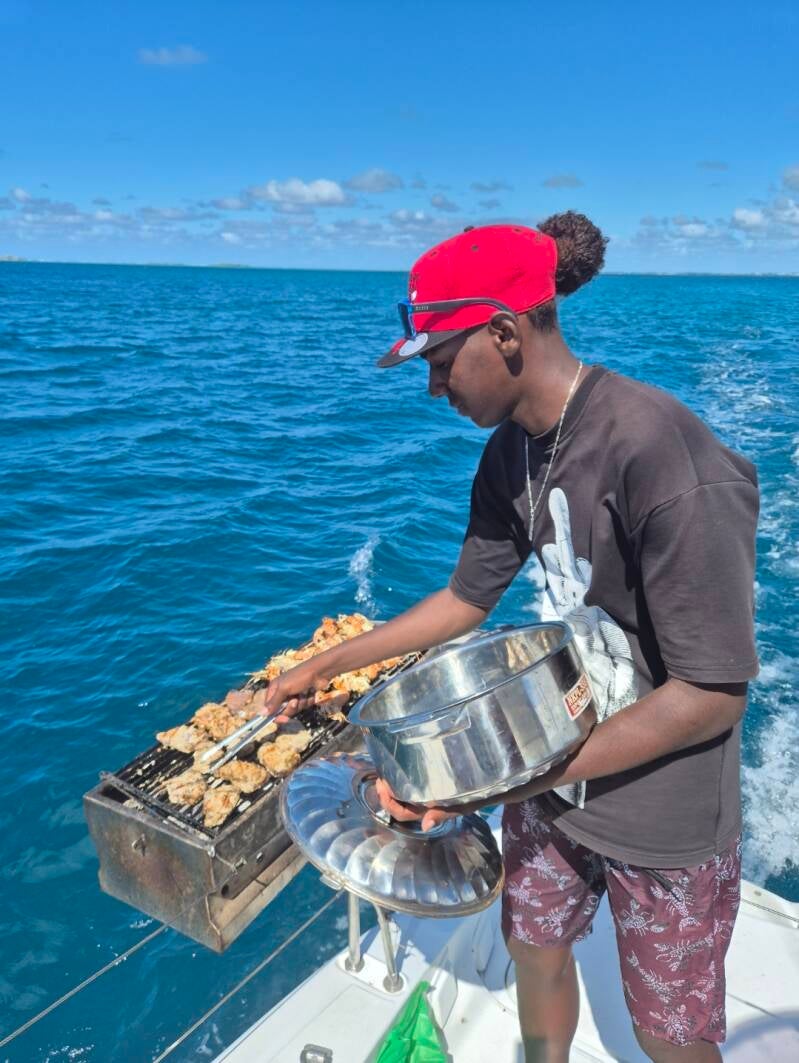 Nos han hecho la comida en el barco. Hemos hecho snorkeling y Bruno ha pescado un pez.