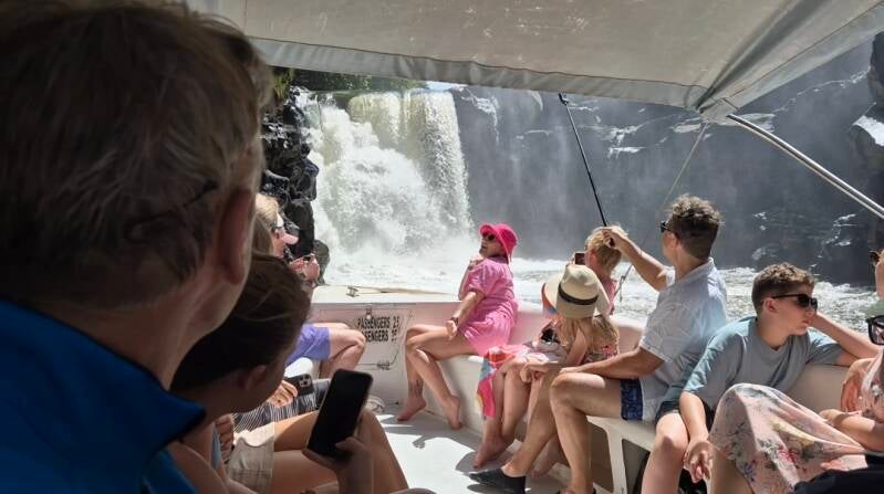También nos han llevado por la desembocadura del Grand River South East (GRSE) a ver una cascada desde una barquita. Las barquitas tenían que hacer cola para acercarse a la cascada. En la orilla hay monos.